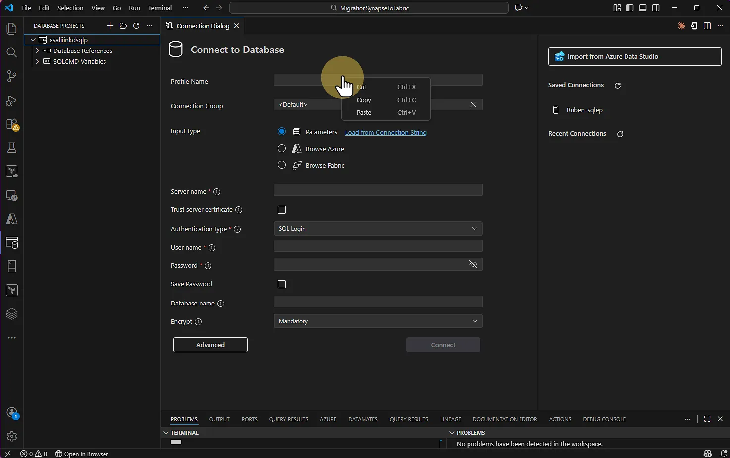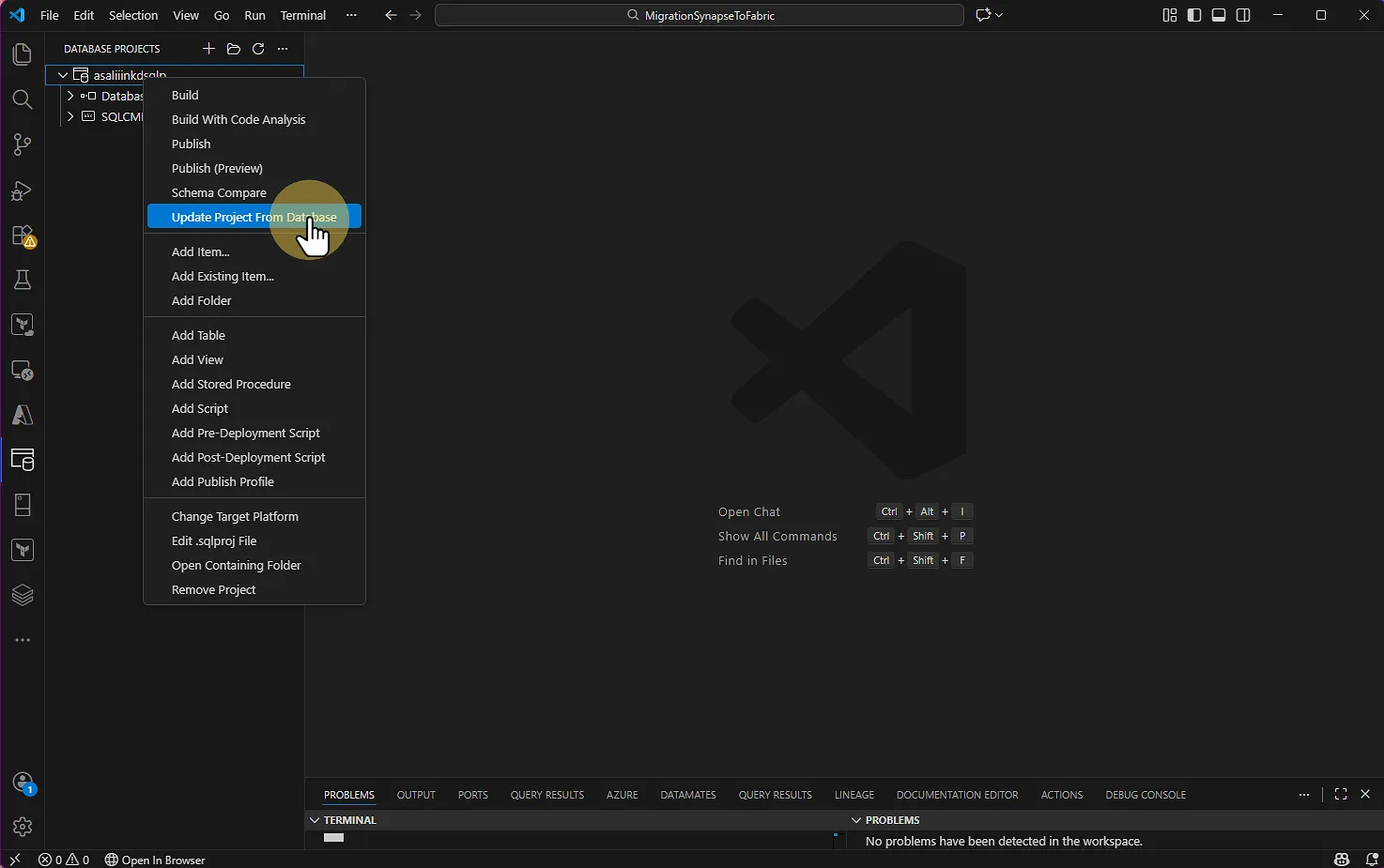 VS CODE : Database projects > Projet > Update Project From Database Sélectionnez votre base de données Synapse sur Azure (si vous avez déjà créé votre connexion)