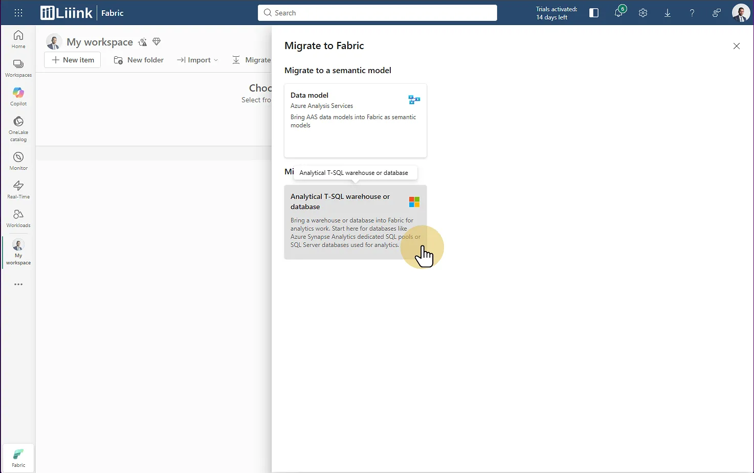 Fabric : Migrate > Analytical T-SQL Warehouse or Database Choisissez Analytical T-SQL Warehouse or Database