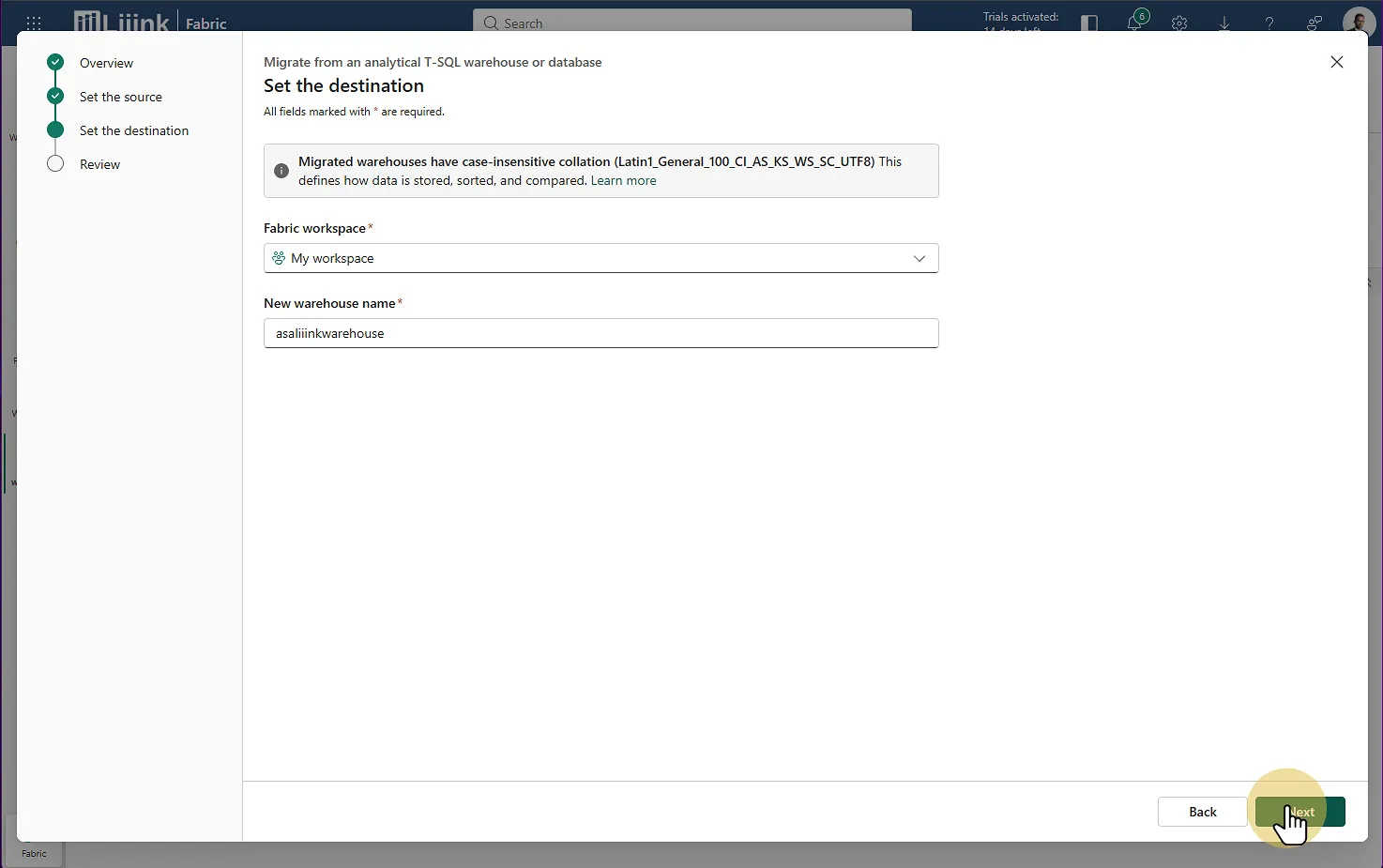 Fabric : Migrate > Set the destination > Choisir le workspace > Définir le nom du warehouse