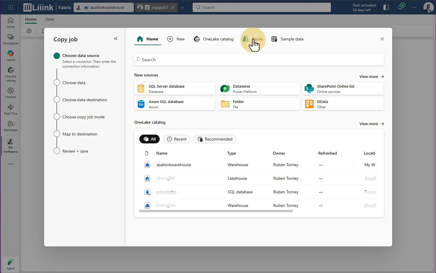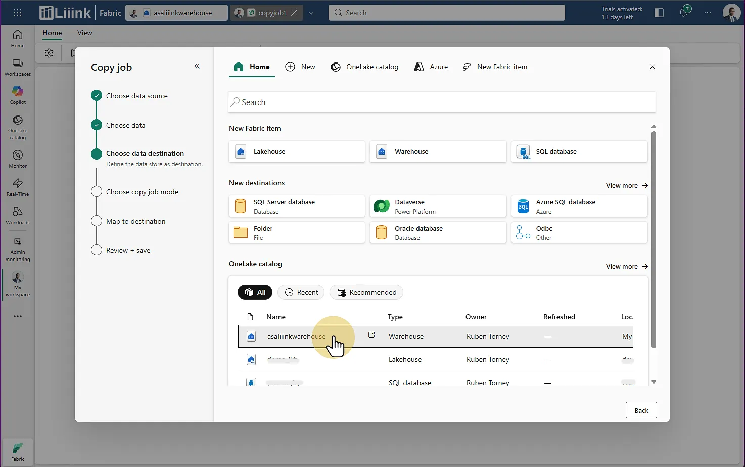 Fabric : Migrate > Migration assistant > Phase 3 : Copy Data > Choisir la destination > Sélectionner le warehouse
