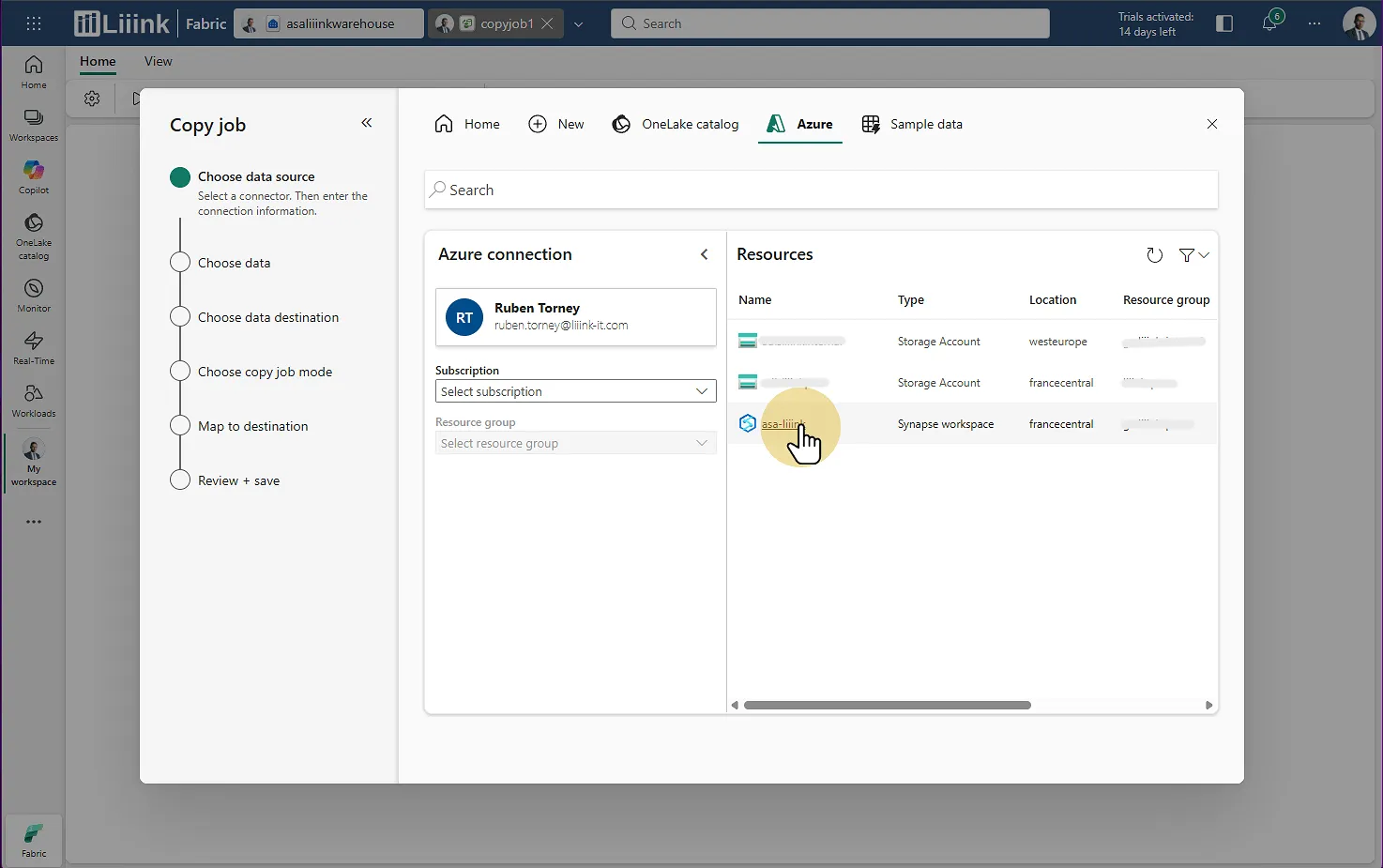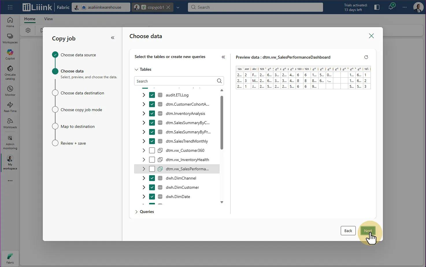 Fabric : Migrate > Migration assistant > Phase 3 : Copy Data > Choisir la source Tables : Choisissez l'ensemble des tables à remonter