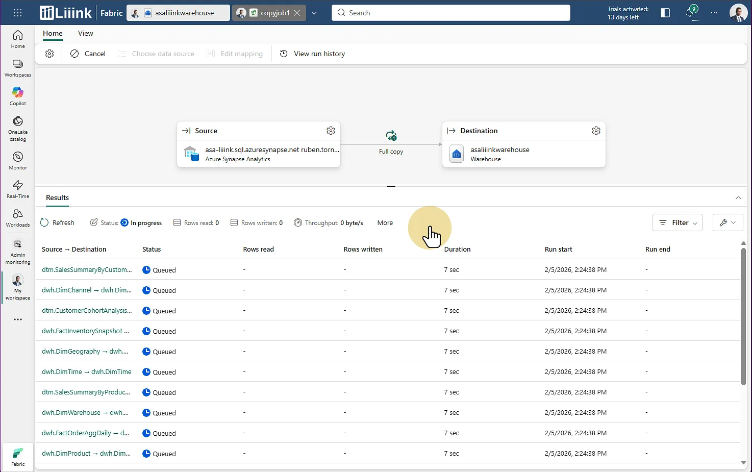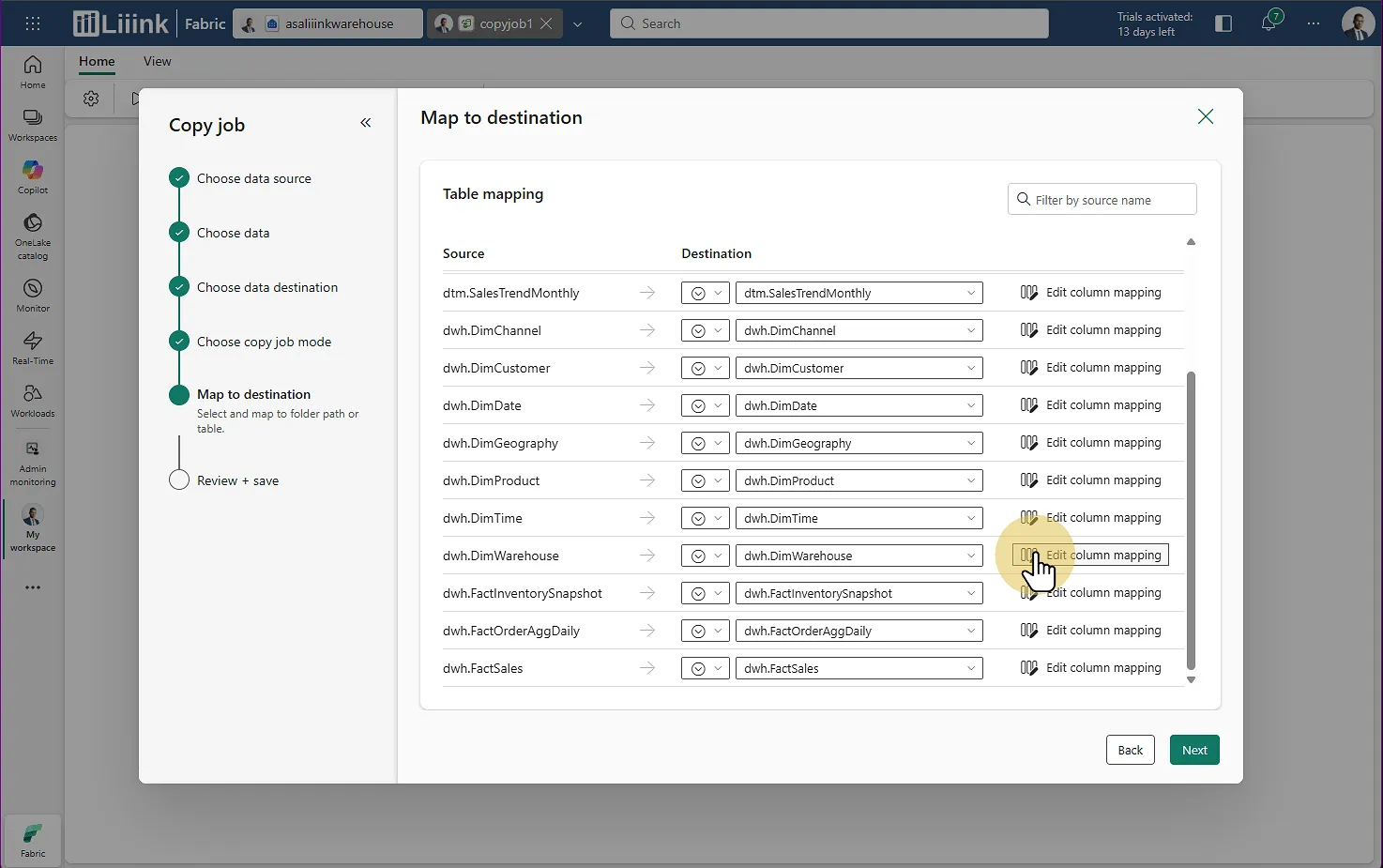 Fabric : Migrate > Migration assistant > Phase 3 : Copy Data > Contrôler le mapping : source <> destiantion